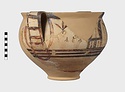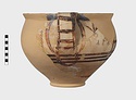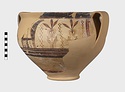 | Description: | Mended from many pieces; almost half of the bowl, with one handle, preserved. Nothing of the base remains. Restored in plaster. Deep broad-bodied vase with out-turned lip and band handle from lip. Rim glazed; wide decorated zone below rim, bordered at bottom by three glaze bands. In the decorated zone, at center, altar; to either side of it, lily motifs, with chain ornament between. Buff clay with gray core; brown glaze; details in white. | |