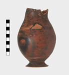 Rather thin glaze, fired unevenly red and black, except beneath foot.