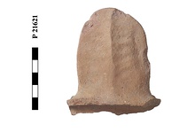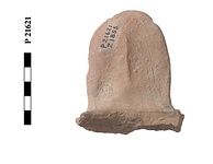 | Description: | Broken off at rim of brazier. Vertical lug, a roughly flattened oval in shape, with a rib down the center on inside and outside and faint indications of "leaves" springing from this on the outer face. Coarse red clay, unglazed. | |