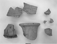 | Description: | About half of mouth and neck preserved and one handle stub, of a large amphora with thickened rounded rim. On one side of the neck, a bird to left, in outline, with checkerboard wing. Soft pink to gray fabric with buff surface. Thin glaze, worn, on outside of rim. | |