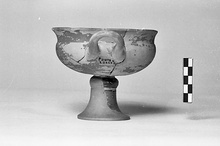 | Description: | Made up as one but association not absolutely certain. a) Five joining fragments preserve about half the bowl and one handle of a round-bodied cup with flaring rim. The handle is uptilted, rounded at the end, and set on the wall of the cup just below the rim. Black glaze fired red except for a black patch on exterior. Much of glaze peeled and surfaces soft and wear easily in places. b) From the side of the stem, not certainly from same cup as a). Heavy moulded ring at top separated from the lower part of the stem by a narrow groove. The stem spreads into the foot, the edge of which is not preserved. The hollow of the stem is tube-like, and does not diminish to a cone: at its upper end it is more than a centimeter in diameter. The groove below the moulded ring is reserved and reddened, and there is a narrow border, also reserved and reddened, at the upper boundary of the ring. Otherwise glaze and fabric as in a). Cf. Agora XII, no. 442. | |