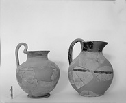 | Description: | Largely complete; missing a few fragments from body and one from rim. Spreading foot; the resting surface is rounded upward along its outer edge, and the pot rests actually only on the inner circumference of this surface. The inner face of the foot slopes up the underside of the floor, which is convex. Globular body; short, concave neck; round mouth, with lip rounded toward the outside. Flat handle with raised edges, not truly vertical. Exterior is covered with dilute glaze wash of light brown color (some base surface at neck and shoulder). Band of dull black to brown glaze at mouth, both inside and out, reaching halfway down the neck. A narrow glazed band surrounds the body at the level of the handle root. And there is some black glaze, unevenly applied, on the outside of the foot. The interior is reserved. | |