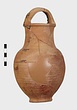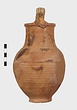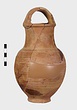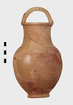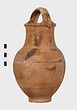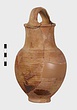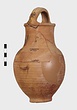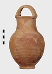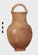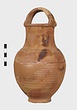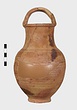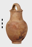 | Description: | Fragments of handle and body missing; restored in plaster. Ring foot; ovoid body; convex shoulder merging into a wide, straight neck with small everted lip; lip grooved on vertical surface; handle of basket type, ridged. Grooves on shoulder and at middle of neck. Body wheel-ridged. Reddish-buff clay. Unglazed. | |