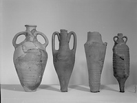 | Description: | Base and parts of neck and body missing; restored in plaster on basis of P 13591. Slender ovoid body (on false ring foot); sloping shoulder; tall neck, flaring slightly at top and terminating in thin, flanged lip; two vertical handles bowed out from body near lower attachment. Buff to pinkish-buff clay, rather coarse; self-surfacing. | |