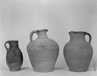 | Description: | Most of neck missing; otherwise intact. Restored in plaster. Ring foot; slender ovoid body; no shoulder; rolled lip; single vertical ridged handle. Oblique gouging from base of neck to point of maximum diameter. Hard brownish clay with bits. Dull purplish-brown glaze over upper two-thirds of body. | |