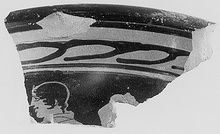 | Description: | Rim fragment. Probably from the reverse. The head and a little of cloak of a draped male figure, left; around his head a white fillet with point at front. No relief contour. | |