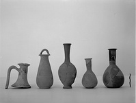 | Description: | Neck and part of body and foot missing; restored in plaster on basis of P 8790. Ovoid body on small ring foot. Probably had long neck with everted lip. Hard, brittle, brownish-buff clay, fired gray at core; unglazed. The shape is neither the Hellenistic fusiform nor the early Roman globular type of unguentarium. | |