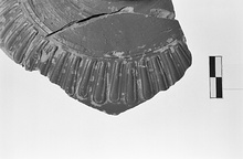| Description: | Two joining fragments preserve part of pedestal foot and of base of bowl, from a pedestalled krater of Dragendorff's form 11, with no trace of angularity in profile of bowl as far as preserved. At base of decorated zone, a band of godroons. Typical clay and glaze. Western Sigillata. | |
