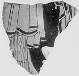 | Description: | Broken all around. Wall fragment of a hydria(?). At left, lower part of female figure wearing chiton and bordered himation, at right, part of the bordered cloak of another figure. No relief contour. | |