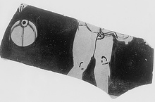 | Description: | Wall fragment broken all around. Mid-part of a youth with strigil; at left a small aryballos corded for carrying; the fingers of a hand above. No relief contour. Firm glaze. Thin glaze wash inside. | |