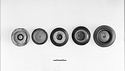 Description:   Much chipped. Convex sides narrowing towards top. Underside recessed, so as to form broad ring foot. Good black glaze; underside reserved except inner edge of foot and concentric circles at center.