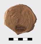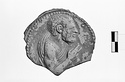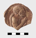 | Description: | Broken all around. Medallion almost complete: within border of dots, the upper part of a bearded figure, right, wearing a himation leaving the right shoulder free; right arm bent at elbow, hand raised towards chin. Orange-buff clay. Matte red glaze on inside, somewhat flaked; bottom unglazed. Cf. P 15175, same head: Zeno? | |