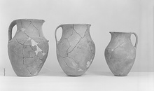 Description:   Mended from several pieces. Small pieces from rim and body missing; restored in plaster. Slightly thickened rim; band handle from lip with thumb impression at lower attachment; flat bottom.