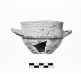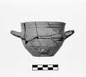 | Description: | Amended description in light of new fragments. Total of 16 fragments, now preserving almost complete skyphos. Flat disk base preserving string marks. Rim slightly flaring, with plain rounded lip; horizontal handles. Paint applied rather carelessly, streaking; worn and tending to flake. Fired brown, approaching black where thickest. Interior painted except for preserved band at lip. Lower wall to handle zone on exterior painted solid. Handle painted. Three horizontal bands on rim. Handle zone decorated with vertical stripes (rather than zigzag) except near handle, where there appear to be careless chevrons. One of the new joining fragments preserves a slight dent made prior to firing. Clay and reserved surfaces fired close to 7.5YR 7/4. | |