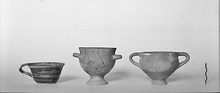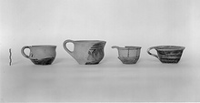 | Description: | Intact. Flat bottom, slightly out-turned lip; band handle from lip. Streaky thin black glaze inside and out; bottom unglazed; rim reserved inside and at edge outside, banded inside. Bands also on handle. Buff clay. Late Geometric. | |