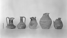 | Description: | Fragments of lower wall and bottom missing. Small oinochoe with broad pear-shaped body and flat bottom. Narrow neck tapering towards top; narrow out-turned rim. Band handle from rim. Thin streaky grayish brown glaze all over exterior, except bottom and upper surface of lip. Handle banded outside, unglazed inside. Buff clay. | |