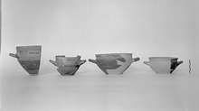 | Description: | Almost half, with one handle, preserved; whole profile given. Mended from four pieces. Almost vertical rim. Slightly slanting handles, round in section. Slight groove sets off a low base, flat underneath. Inside and lower half outside glazed; top of rim, handle space and base (profile and underneath) reserved. On the rim outside, glazed horizontal bands; one band on handle. Between the handles reserved zone decorated with groups of vertical glazed bands and panels between; in the panels degenerated birds. Below the zone four more bands all around. Brownish-red glaze; pink clay. | |