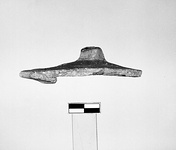 Description:   Small segment only remains. Very slightly convex with rim thickened and turned under on underside and pierced knob at middle.