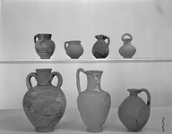 | Description: | Four fragments give most of profile and apparently complete height. Restored in plaster. Double conical body with indented base. Short narrow neck and plain everted lip; round mouth. Vertical grooved handle. Gritty, reddish-brown clay; unglazed. | |