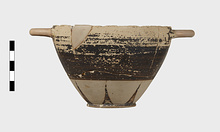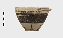 | Description: | Kotyle, mended from several pieces. Both handles, parts of rim, small pieces of body, restored in plaster. Low ring foot; rim curves slightly in. Rays from bottom to about one-third up. Above, solid glaze except in handle spaces. Traces of narrow white bands over the glaze; thin white line at rim; three concentric circles on underside. Light buff clay (greenish deposit on bottom?); glaze greenish to black, somewhat shiny. Protocorinthian. | |