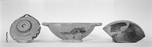 | Description: | Plate mended from five pieces, one handle missing. Low disk foot, shallow convex body. Handles attached at rim. Inside, solid glaze except for reserved circle toward center. Verticals on rim. Wavy band below rim outside; rest of outside covered with narrow bands. Broad band near foot. Two concentric circles on bottom. Pinkish-buff clay; red to black dull glaze. | |