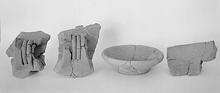 Description:   Mended from many pieces; small parts of body restored in plaster. Broad slightly concave resting surface. Flaring sides; rim rolled, set off from sides by groove.