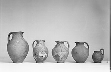 | Description: | Mended from many pieces. Front wall and rim and parts of back wall including most of handle, restored in plaster. Vertical ring foot. Rolled handle attached at rim. Depression at lower attachment. Ovoid body; rounded neck; flaring rim, slightly thickened. Pinkish micaceous clay with yellow surfacing. Handmade. | |