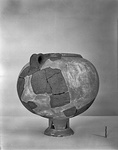 Description:   Many non-joining fragments preserve part of rim and handles, part of body and of stand. The rest restored in plaster. Rounded body; short, broad, concave band handles attached somewhat below rim. Rim rolled, outside flattened and sloping inward and offset from body. Rounded bottom preserves parts of high vertical ring, probably a stand.