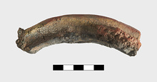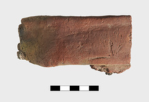 | Description: | Fragment of rim(?) of coarse pot with metal slag deposited on inside. Original edge at top and at one end. From a metal worker's shop. Cf. MC 915 (Τ 1784) and P 22795 (Τ 1785) and discussion on Nb. p. 3086 for other metal workers' waste from same area. | |