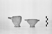 | Description: | One handle broken and a few chips missing. A small skyphos-shaped pot; high solid base, left rough from wheel: inturned lip. Pinkish-buff clay, unglazed. Miniature votive skyphos. | |