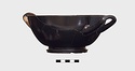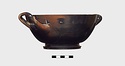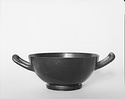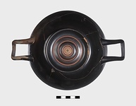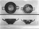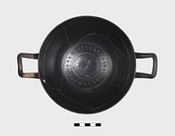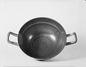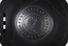 Description:   Mended from many pieces. A small part of rim and the end of one handle restored in plaster. Stamped inside with tongue pattern and palmettes in band around central rosette with pointed petals. Lip offset inside. Three concentric raised black glaze bands on bottom, two broad and one narrow. Moulded foot.
