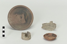 | Description: | Mended from two pieces. A flat plate, badly warped in making. Low ring foot, grooved on resting surface; two grooves around underside and a broad groove on the plain rounded rim. Thin dull glaze wash on the floor, and some remains of glaze on the underside; the top of the rim reserved. | |