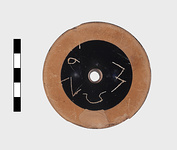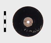 Description:   Kylix foot, complete except for chips; vertical face slightly concave. Glazed on top surface and on inner part of underside; a glazed line also around lower edge of vertical face.