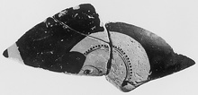 Description:   Many fragments of a much broken column krater, preserving parts of neck, rim, handles, handle-plate and walls. A little of the figured scene on one side preserved; Athena and a giant?