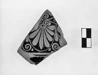 One palmette and spirals from lyra on each side of it, from the upper neck zone of a large volute krater: double palmette, with ribbed petals alternating with double lyra. Relief outline.