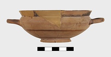| Description: | Mended from many pieces; parts of rim restored in plaster. Low ring foot; very pointed, shallow body; high flaring rim, sharply offset; handles at greatest diameter. Glazed inside except for reserved band at junction of rim and wall. Two purple circles at center of floor. On outside, rim, handles glazed. Two narrow glazed bands on lower part of body, and outside and inside of ring foot glazed. Two concentric circles beneath. Pinkish-buff clay. Thin metallic fabric. Streaky brown to black glaze. | |