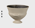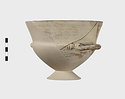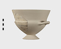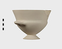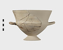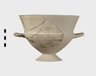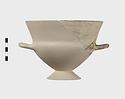 Description:   Section of rim, body, and one handle, preserved; mended from many pieces; foot and one handle missing; restored in plaster. High flaring rim, set on pointed bowl; rim drawn in where it meets sides; rolled handles turning up slightly, set on this shoulder.