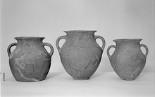 | Description: | Mended from many pieces; parts of rim and body restored in plaster. Low vertical ring foot; wide neck, profile continuous with body; spreading rim; vertical handles set on shoulder, with thumb marks. At about middle of wall on one side, near point of greatest diameter, a small hole, apparently chipped through, with a dark stain around it. Russet clay with gray core; brownish surfacing. | |