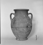 | Description: | Mended from many pieces; parts of rim, body, one handle restored in plaster. Flaring ring foot; ovoid body; short neck; rolled rim; band handles at shoulder. Light buff clay. Covered inside and out with white surfacing. Four narrow bands of glaze on body, broader one on base. Vertical wavy line on handle. Black to brown glaze almost entirely worn off. Whitish surfacing much flaked. | |