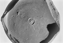 | Description: | Foot and trace of wall preserved. Ring foot; oblique wall. At center of floor, a device stamp: eight-rayed star. Cinnamon-red micaceous clay. Reddish-brown glaze. Samian A(?) Cup. | |