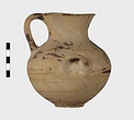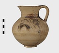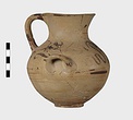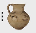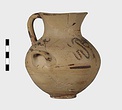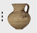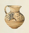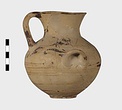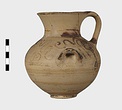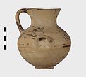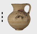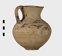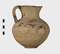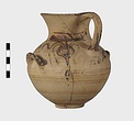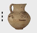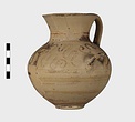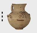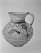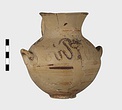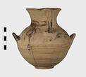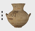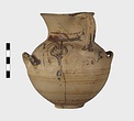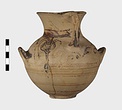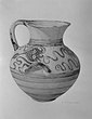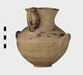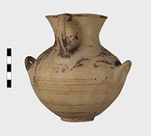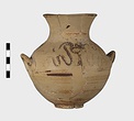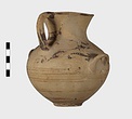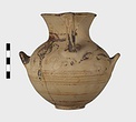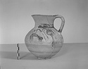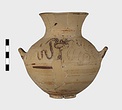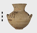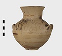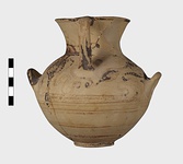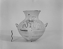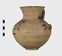 Description:   Mended from many pieces, parts of neck and walls and of one horizontal handle restored in plaster. Small ring foot; globular body; flaring mouth; thick band handle from rim; rolled horizontal handles.