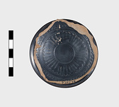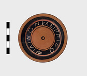 | Description: | Base of stemless cup or large heavy-walled cup skyphos; molded ring foot, a light above a heavy molding. Impressed on the top, rays; outside them a simple braid pattern. The resting surface of the foot reserved, and the space beneath, neatly decorated with a central circle and dot and, at the outer circumference, a narrow and a broad glazed band. Excellent glaze. Inscribed in the broad black outer band on underside: Φιλινον Κλειππιδο | |