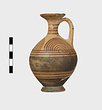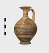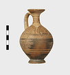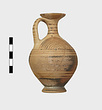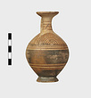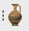 | Description: | Broken in several pieces and two small bits missing; restored in plaster. On shoulder, three groups of concentric semicircles; on neck, four rings; rim glazed above; on handle, bars; on wall, two pairs of reserved lines; no ring at base of handles. Buff clay. Thin glaze fired blackish to light brown in places. Small round hole in shoulder to right of handle. | |