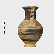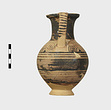 On shoulder, a panel of crosshatching is flanked to right and left by two groups of concentric semicircles filled with solid triangles. On wall, two groups of three reserved lines. On handle, crossbars. Ring at base.