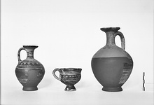 | Description: | Broken and fragmentary; restored in plaster. Zigzag line on lip band; sawtooth in black below; two reserved lines on wall; crossbars on handle. Pinkish-buff clay. Thin flaky glaze, grayish-black to light brown. | |
