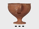 | Description: | Mended from many pieces; wall and rim fragments and one handle missing; restored in plaster. Low stem; spreading foot; underside of foot slightly concave, with a neat hemispherical depression at its center; deep bowl; narrow out-turned rim; low band handles. Coarse buff clay. Covered with dull red-brown glaze paint inside and out except on underside of foot. | |