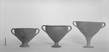 | Description: | Base, stem, one handle and much of wall missing and restored. Type and fabric similar to P 23571, but the bowl deeper and the walls more sharply tapering. Coarse buff clay. Thin brown glaze wash. ADDENDA Acropolis burnished ware, cf. Mountjoy (1981). | |