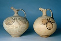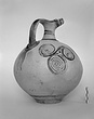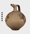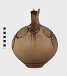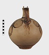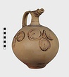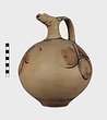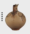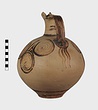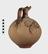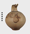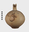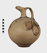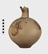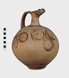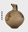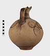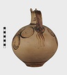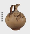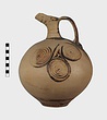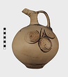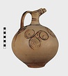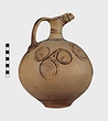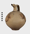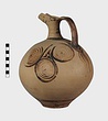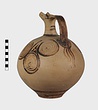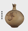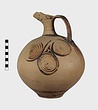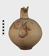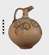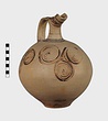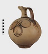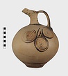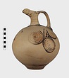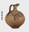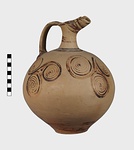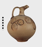| Description: | Intact. Flat bottom; globular body; trough spout; ridged strap handle with a pronounced boss at the base of the handle. On the shoulder, three concentric spirals; tails hang from handle attachment; bands around neck, spout and lower wall, just above bottom; outside of handle glazed. Light yellow clay, well smoothed. Red to brown glaze. | |