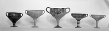 | Description: | Broken but complete; a few small bits restored in plaster. Flat foot with deep depression at center beneath; low stem; deep bowl; two vertical band handles. Buff clay. Covered with deep lustrous red glaze, except under foot. | |