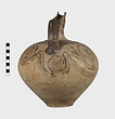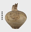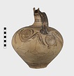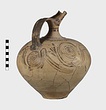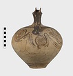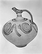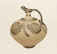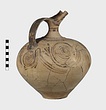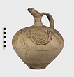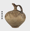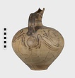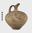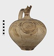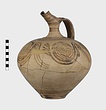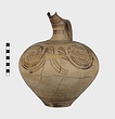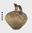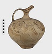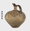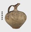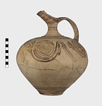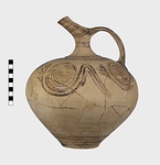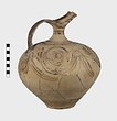 | Description: | Much broken but largely complete; small bits from base and wall restored. Broad piriform body on narrow flat bottom; trough spout; strap handle, ridged down the middle and with a bulge at the lower attachment; flat plastic ring at junction of neck and shoulder. Large spirals and groups of petals on shoulder; groups of bands on spout, neck and around lower wall; outside of handle glazed. Greenish-buff clay and surfacing. Black glaze much flaked. | |